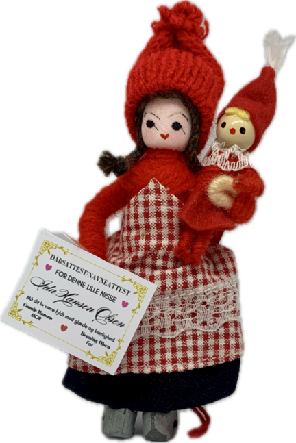 Når du bestiller denne nisse, skal du skrive barnets navn, mors navn og fars navn i besked
